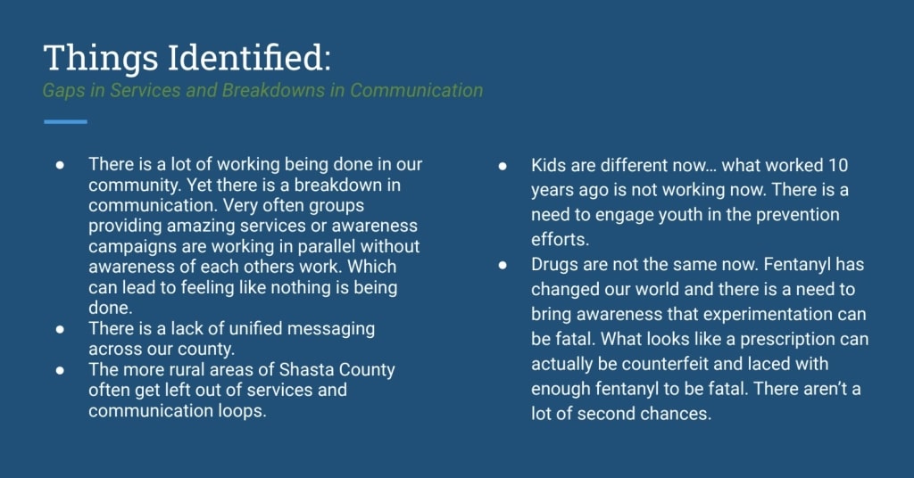 According to the presentation, members of the working group spoke with representatives from school districts, Shasta County Probation, Shasta County First 5, Shasta County Health and Human Services Child Welfare and Public Health departments, the Shasta County Youth Substance Use Coalition and Girls Inc. They also contacted a number of individuals who work in the youth prevention space including Rocky Herron, Hal Zawacki, Jennifer Epstein and Ed Ternan, Courtney Chase, Laura Garett, Jennifer Volbrecht, and Paula Young.