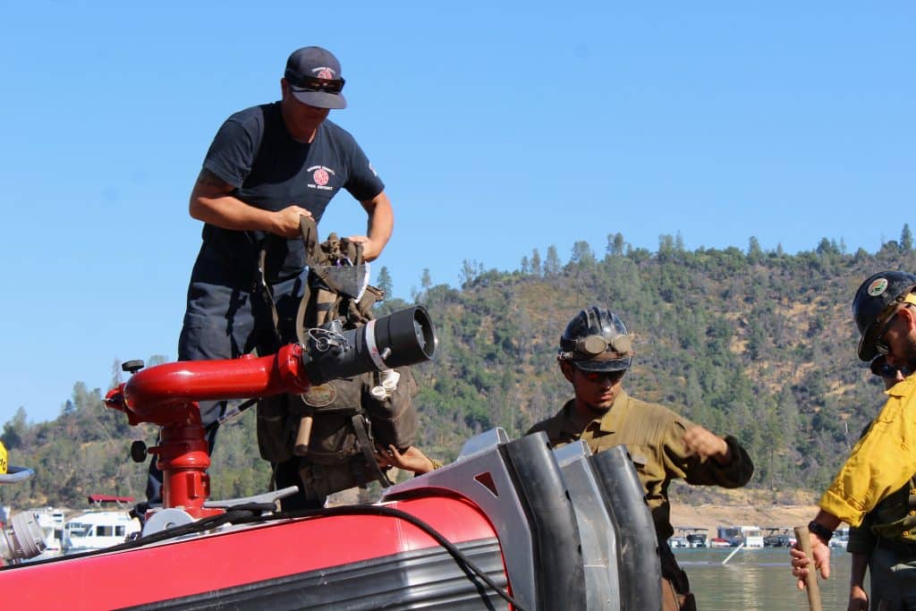 Though boats have been used to help fight fires in this region before, many of the firefighters and fire personnel working on the boat ramp told Shasta Scout that they’ve never seen boats utilized to this extent. Brenton Baum, a boat supervisor trainee and San Bernardino County Fire Department fire captain, said boats have been needed because of the difficulty accessing fire lines by truck and the complexity of using aircraft amid low visibility conditions.