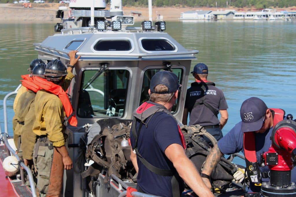 On a hot and sunny morning in July, dozens of firefighters and other fire service workers report to a boat ramp on the Pit River Arm of Shasta Lake, all working on various tasks to get ready for the day.