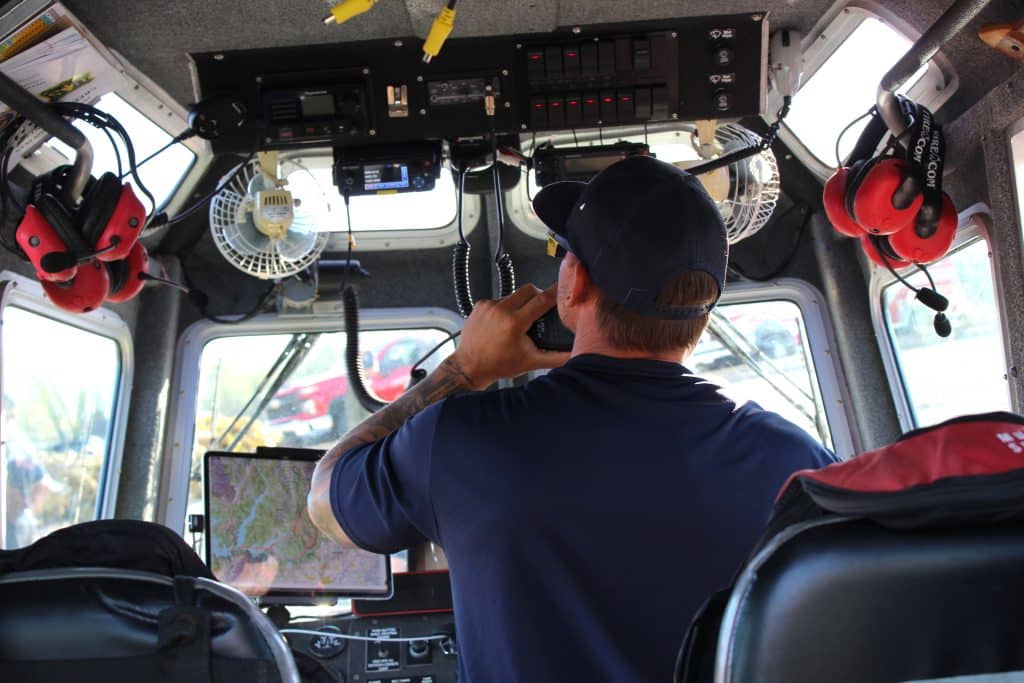 Crew members’ responsibilities include transporting firefighters and their equipment across the lake to reach the fire, taking personnel back once their shift is over and fighting fire along the shoreline.