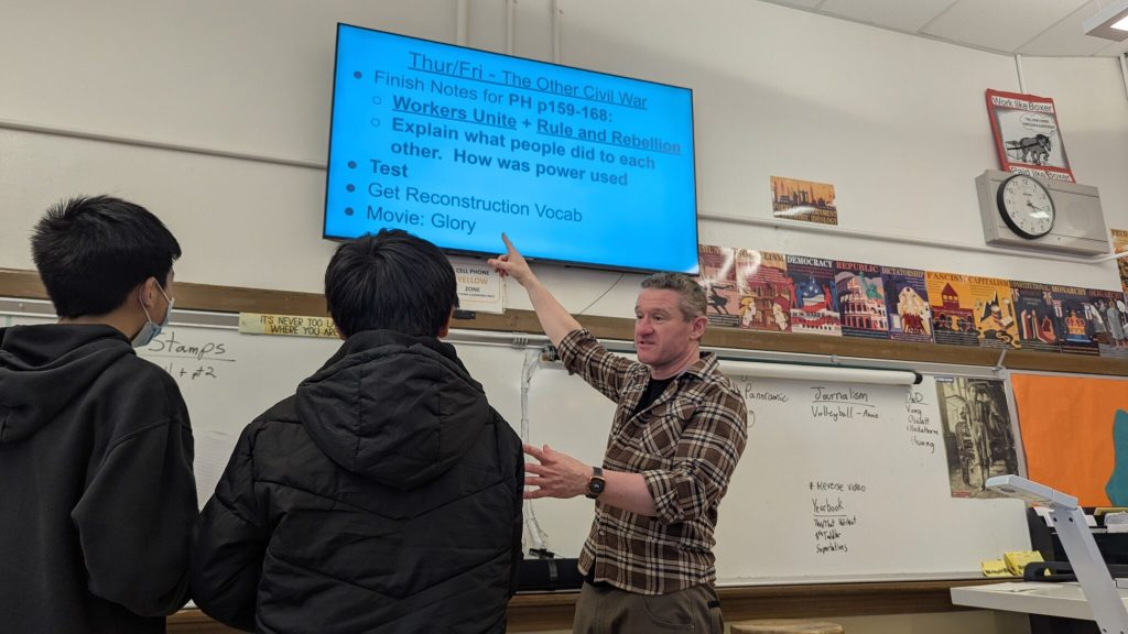 At another California middle school, a veteran teacher is taking a slightly different approach. Instead of using AI at the beginning of the semester, Matthew Helmenstine, a teacher at Marina Middle School in San Francisco, doesn’t. Helmenstine teaches eighth grade social studies and journalism and has taught for 25 years in Italy, Japan and the United States.