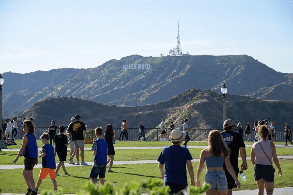 People visit the Griffith Observatory with the Hollywood sign in the background in Los Angeles on July 13, 2023. Photo by Phelan M. Ebenhack via AP
