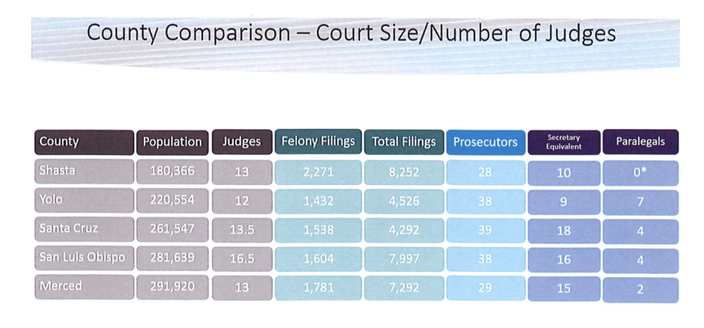 Bridgett compared her team’s caseload with other counties with a similar number of judges as Shasta, 12 or 13. According to her chart, the DA files approximately double the number of criminal cases as Yolo and Santa Cruz, with about ten less prosecutors.