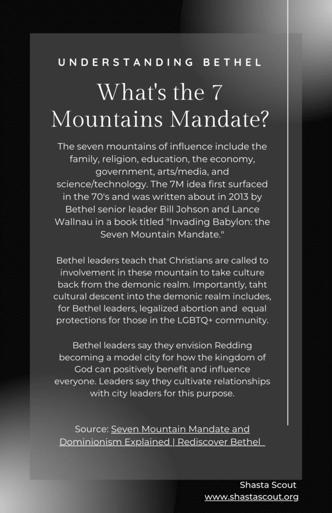 Bethel teaches what is known as the 7 Mountains Mandate, a theology that encourages Christians to influence the “seven mountains” of society, including the political realm, to bring God’s kingdom realities to earth. The theology is sometimes referred to as dominionism, and is widely believed to include the idea that believers should “take dominion” over society to bring more of heaven to earth.