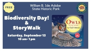 Come celebrate Biodiversity Day at William B. Ide Adobe SHP. Join us along the water on the Cottonwood Trail at 11 am for a guided nature walk where you’ll discover native plant species unique to this part of California. Discover California’s diverse wildlife with special guests from Shasta Wildlife Rescue & Rehabilitation. Get creative with nature crafts and activities. Enjoy the StoryWalk® featuring Owls by Gail Gibbons. The event and parking are free.