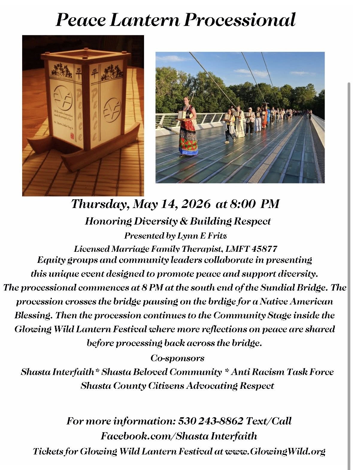 You can witness the Peace Lantern Processional cross the Sundial Bridge at 8 pm from the south end to the north side. The processional will enter the Glowing Wild Lantern Festival for about 30 minutes then will cross back across the Sundial Bridge. To enter the Glowing Wild Lantern Festival requires purchasing rickets from Turtle Bay Exploration Park.
