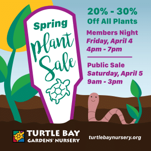 - Turtle Bay Members sale is Friday, April 4th, from 4:00 PM to 7:00 PM, with 30% off all plants