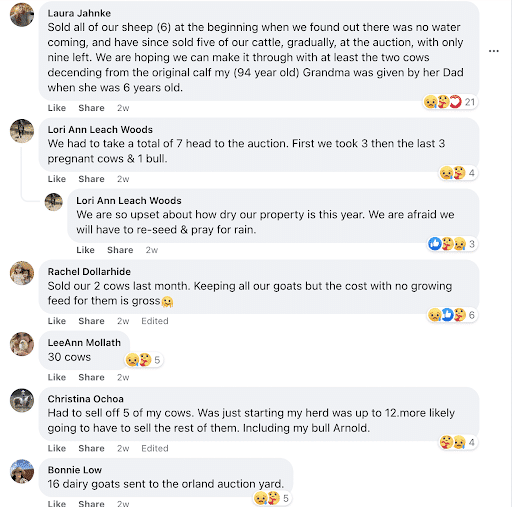 Laura Jahnke, an A.C.I.D. irrigator, commented as part of a thread on Facebook earlier this month, that she has sold most of her animals, but is doing her best to hold on to her last two cows, descendants of a calf given to her ninety-four year old grandmother when she was six years old. Jahnke was one of dozens on the thread who said they’d had to sell off livestock due to this year’s lack of water.