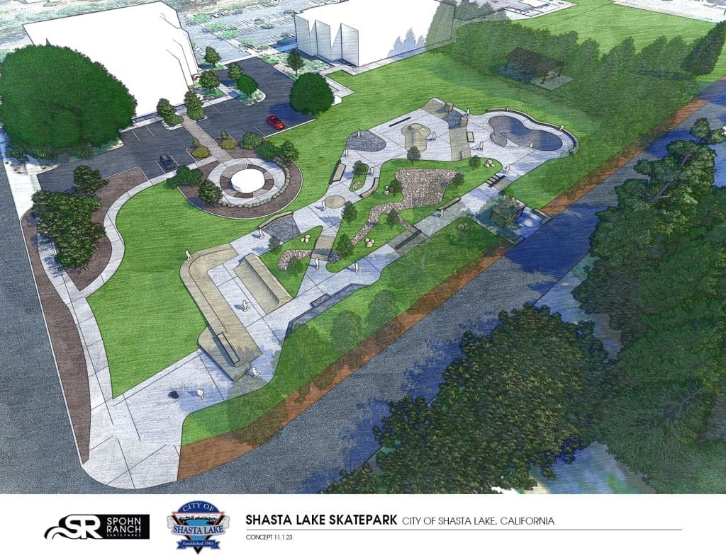 The Los Angeles–based design firm Spohn Ranch was selected to create Shasta Lake’s new skatepark in 2023. They have created similar projects in small towns across the nation, as well as in LA, San Francisco, Chicago, and more than one part of New York City. Spohn Ranch’s plan for Shasta Lake draws from a combination of local input gathered through public workshops and consultation from skating enthusiasts.