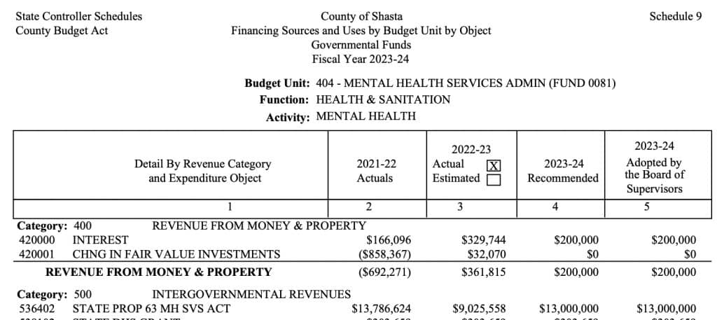 Shasta County’s 2023/2024 fiscal year budget includes $13 M in MHSA funds. The exact amount changes from year to year based on tax revenue. That’s Shasta County’s share of the 95% of the millionaire tax that counties across the state are allocated.