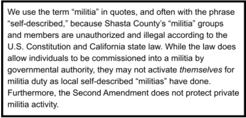 It’s true, of course, that the Shasta County recall was organized, in part, by leaders of a long-standing self-described “militia” here in Shasta County.