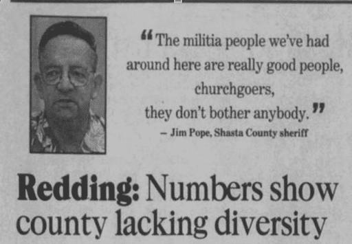 But local “militia” groups are nothing new to Shasta County, and neither is their acceptance by locals. A 1999 article by the Sacramento Bee suggested that Shasta County is “home to anti-government, gun-toting militia groups, survivalists and religious extremists” and quoted the Shasta County Sheriff at the time, Jim Pope, as saying “The militia people we’ve had around here are really good people, churchgoers, they don’t bother anybody.”