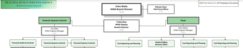 Dean was hired to manage and oversee all fiscal and accounting services agency-wide. He reported, not to HHSA Director Laura Burch but instead to a mid-level manager two levels down, Erinn Watts, head of HHSA’s Administrative Branch which manages HHSA’s fiscal planning, contracts, assets, audits, community relations, and medical billing.