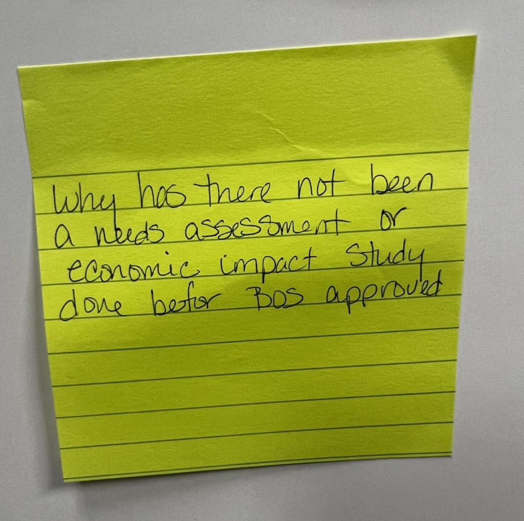 A post-it note shared by an anonymous community member during a recent public workshop on jail expansion asks the county to assess the need for jail capacity first. Read more about the workshop here.