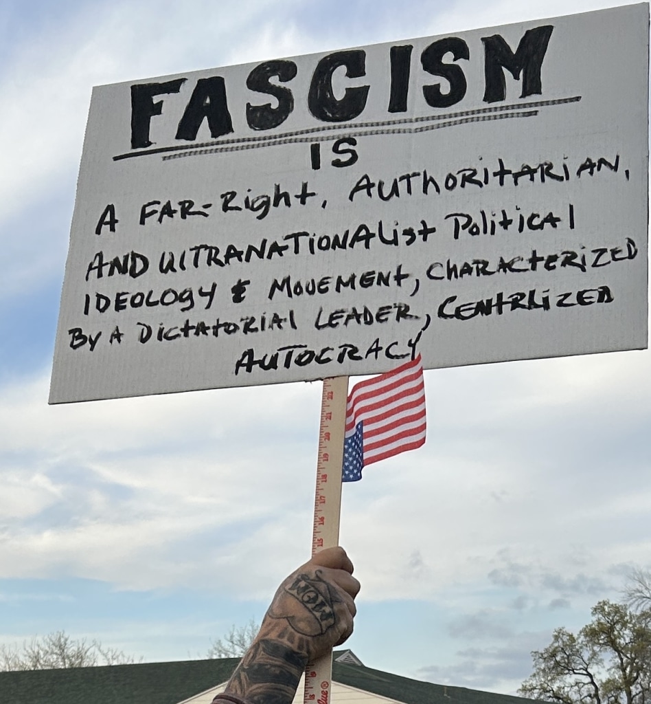 On March 4, in front of Redding City Hall, a crowd of about 400 marched, chanted, sang, walked dogs, and held signs decrying the actions of Trump and Musk. Posters on display noted the definition of fascism, expressed concern that the President is engaging in a coup, and suggested that Trump should be fired.