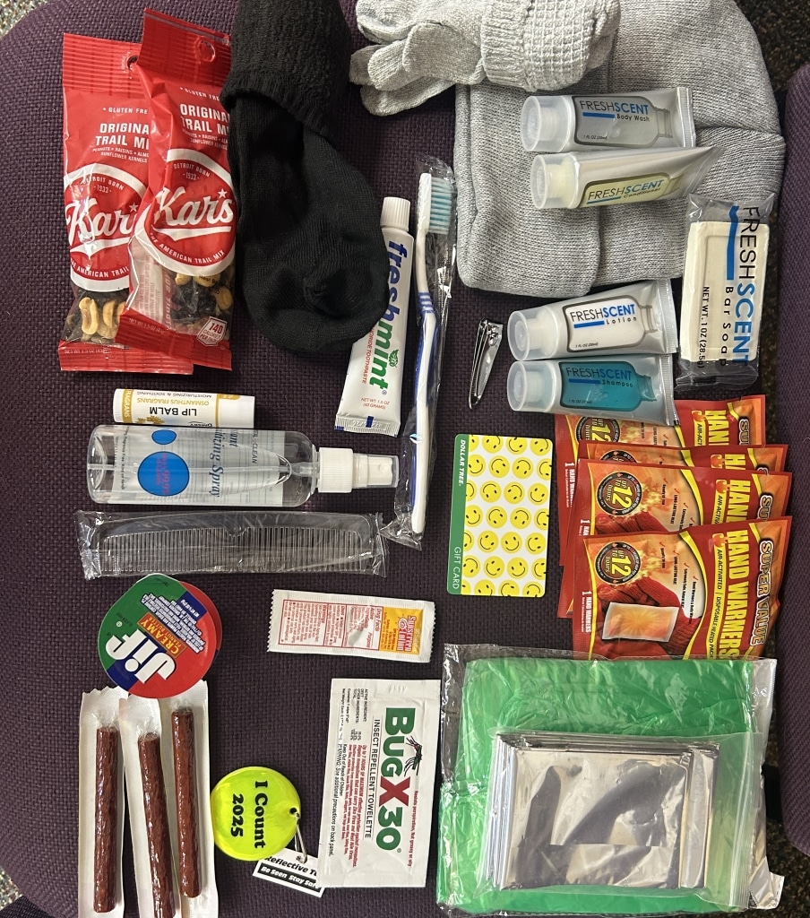 While the team at New Life Discovery Project met with homeless community members onsite, staffers from service organizations deployed out into the city to tally unhoused folks still on the streets. By noon, staffers also began fanning out across the area to approach community members living in communal, self-organized shelters known as encampments, or camps. They distributed bags of resources equipped with reflectors, hand warmers, a beanie and gloves, and snacks.