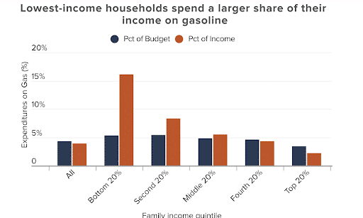 That data shows that Californians on average spend about 4 percent of their income on fuel for their cars and homes, but that increases to 16 percent for those with the lowest incomes, for whom a $20-per-week increase in gasoline prices is more likely to take money from other necessary budget items such as food or housing.