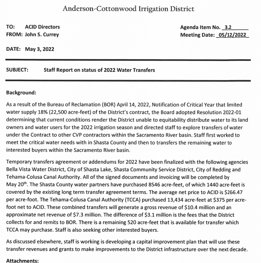 With that report in hand, in April the the A.C.I.D. board decided they had no choice but to sell off the remaining district water to other districts for a net revenue of around $7.5 million, leaving A.C.I.D without any water allocation at all.