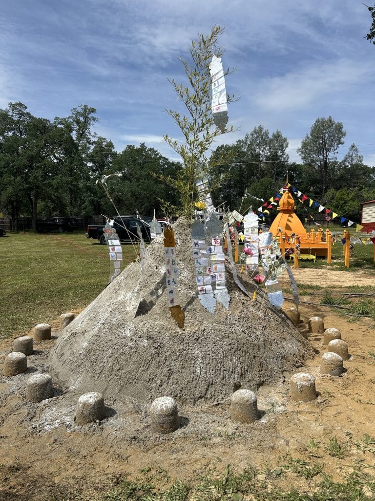 On the grounds of the temple was a sand stupa, a miniature dome made of sand modeled after stupas, the Buddhist architectural term for the structures on holy sites that house sacred relics. In Laos, worshippers gather by the banks of the Mekong River to build sand stupas of varying sizes and intricacies for good luck in the coming year. Jutting from the stupa in Redding were flowers, dollar bills and images of zodiac animals.