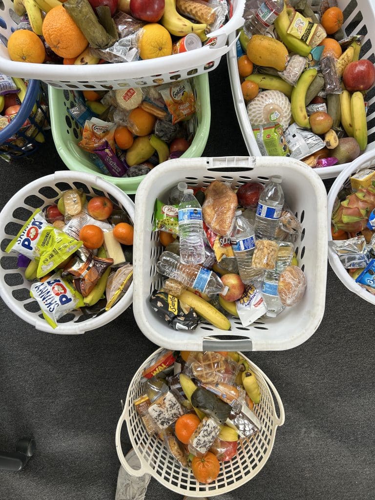 Set throughout the temple and in front of the golden idol were money trees — decorative offerings of potted bouquets of varying heights, affixed with dollar bills. After alms were given, the money trees were paraded around the grounds by a group of women and children led by the temple’s monk, one rhythmically beating a gong as she facilitated a call and response. The offerings, as well as a portion of the food vendors’ profits, will go toward the temple.