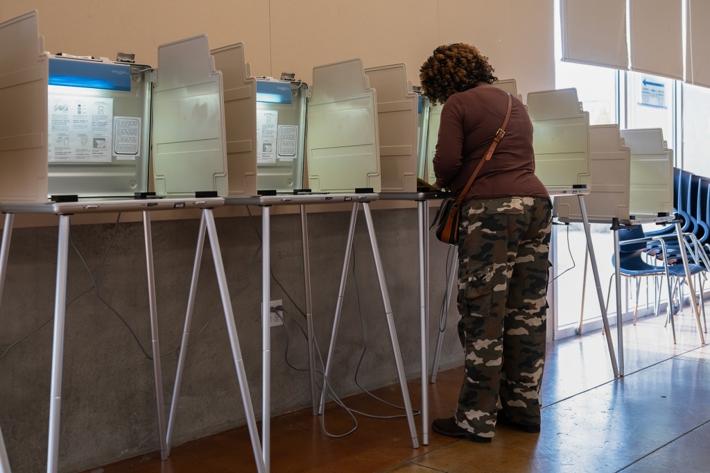 A person fills their ballot at a vote center at Valley Ni-North Laguna Library in Sacramento on Nov. 4, 2025. Photo by Jungho Kim for CalMatters