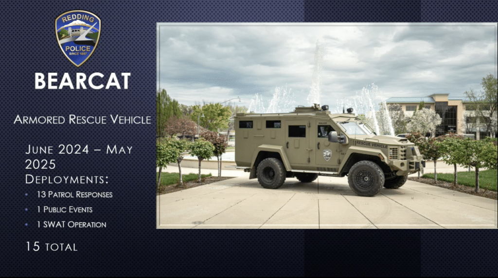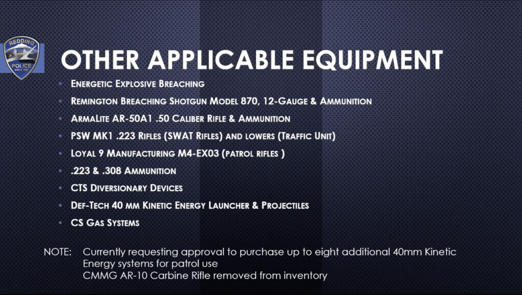As required by a California law known as AB 481, on May 20 the Redding Police Department (RPD) provided its annual public presentation outlining all of the military-grade equipment local law enforcement has in its arsenal. A similar presentation has occurred every year since 2022 when the law was passed.