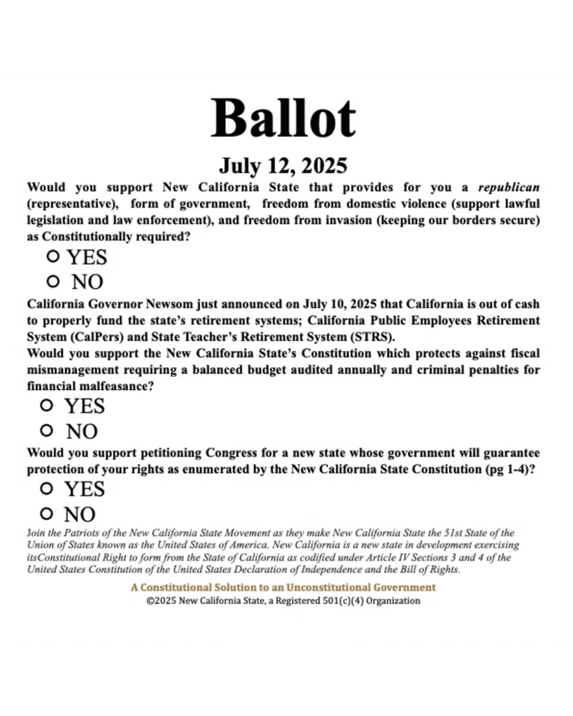 New California State (NCS), a movement attempting to separate from California to form its own state, held the July 12 election in order to approve a provisional constitution. According to NCS, participants representing more than 50 of California’s 58 counties voted, with some making long drives to reach one of the 26 NCS precincts.