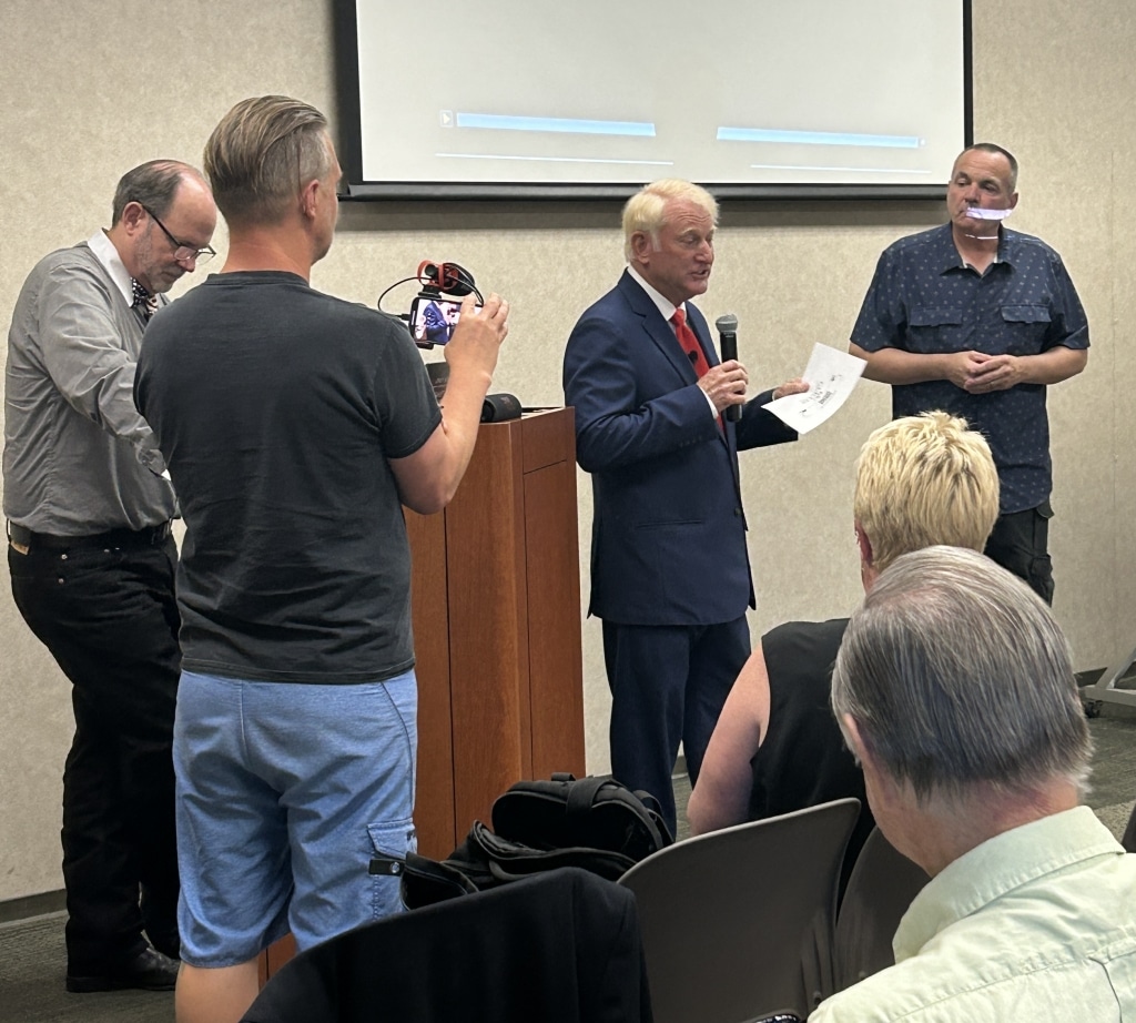 On May 24, newly-appointed Shasta County Clerk and Registrar of Voters (ROV) Clint Curtis suggested a Shasta Scout reporter donate to his campaign. His comment came moments after he told a crowd of about 75 gathered at a private “town hall” at the Redding Library that he needed their money to help him defeat his opponent, Joanna Francescut, next year.