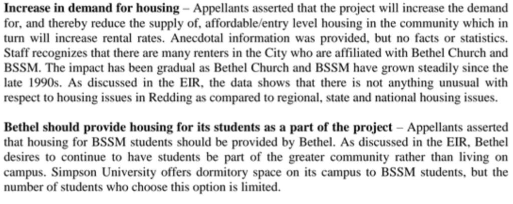City staff acknowledge that there’s no doubt Bethel’s lack of student housing affects the quantity and affordability of housing options within the City of Redding. But they still respond to appellants’ concerns by saying that Bethel doesn’t want to provide housing for students, that students might not utilize that housing anyway, and that data provided in the Bethel campus project’s Environmental Impact Report shows that there is not anything unusual with respect to housing issues in Redding as compared to regional, state, and national housing issues.