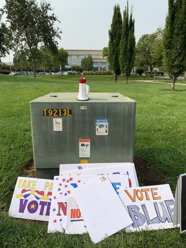 Signs for the No on Newsom Recall Rally. Photo by Annelise Pierce