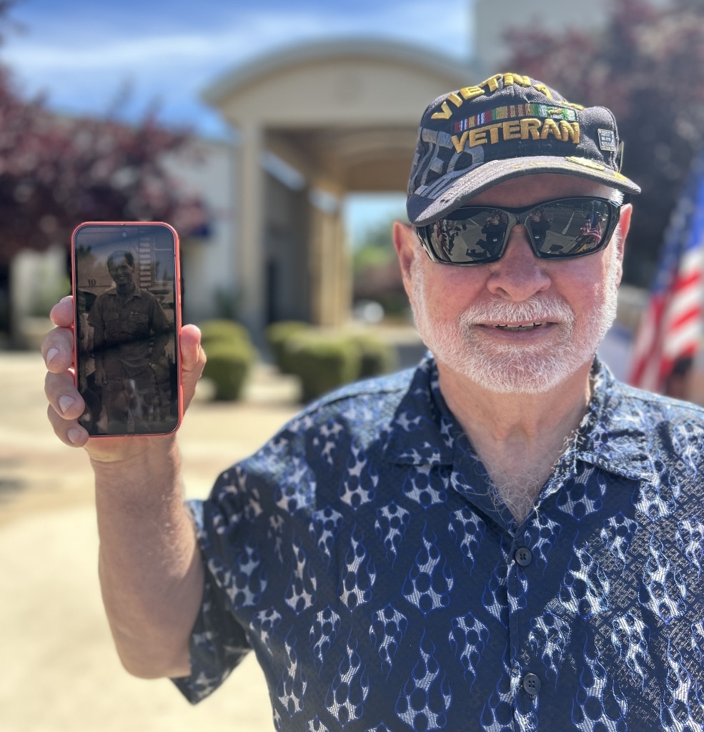 Chuck Keller was one of several veterans who attended today’s protest. He showed Shasta Scout a picture of himself in 1968 during a deployment in Danang, Vietnam. Keller said he was twenty-one at the time and served as a Navy Corpsman, or medic.
