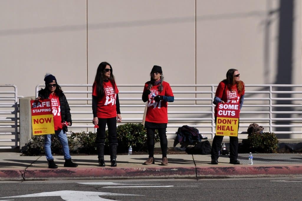 The nursesโ signs and slogans revealed a little bit about their demands. One read โburn out caused this turnout,โ another โdear public, your life depends on the safe ratios,โ referring to the nurse-to-patient ratio that California law requires. Those were two of the same grievances cited by Michelle Gaffney, the union representative for the nurses on strike.