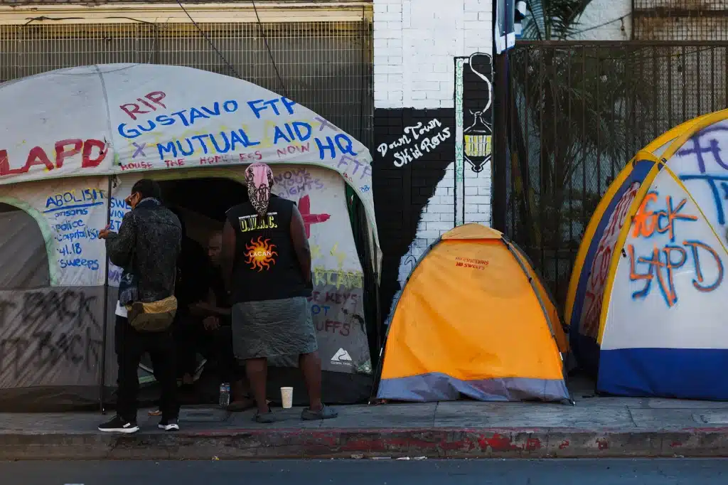 Tents line a street in Los Angeles’ Skid Row neighborhood on Oct. 8, 2024. Many trauma or crime victims also become homeless. Photo by Carlin Stiehl for CalMatters