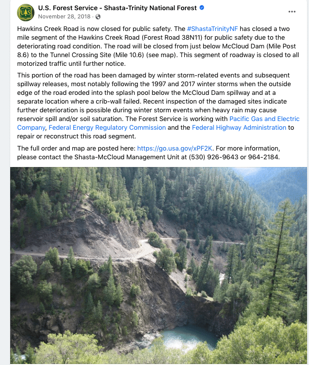 In 2018, heavy rains and strong flows from the McCloud Dam’s spillway caused a washout at the base of Hawkins Creek Road, leading to a Forest Service closure. Photo Courtesy of the U.S. Forest Service.