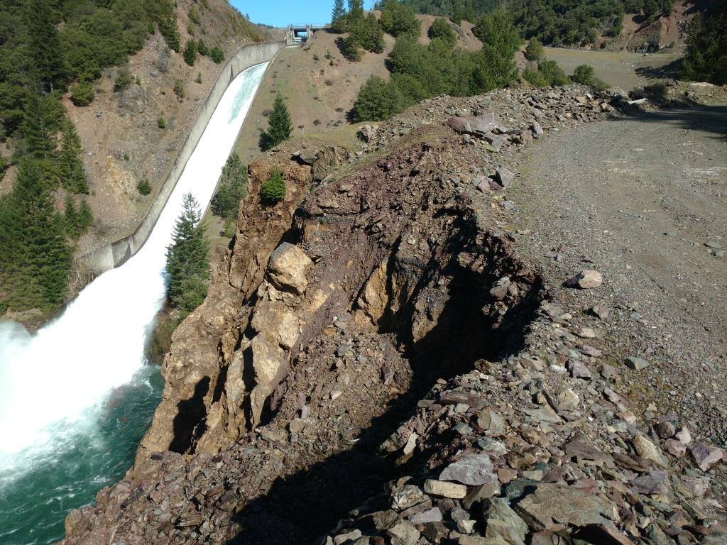 It’s part of what environmental advocates who have spent decades studying hydroelectric projects say is a significant design flaw in the McCloud Dam. Built more than fifty years ago on a bend in the river, the dam allows water to gush from the spillway directly towards the hillside below the road rather than spewing directly downstream away from the road, which would cause significantly less erosion.