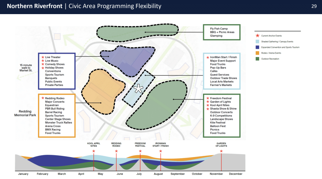 The current draft plan is divided between the northern and southern portions of the riverfront, and it prioritizes environmental health, Indigenous cultures and entertainment. The northern riverfront concepts include remodeling the Redding Rodeo Grounds and Civic Center, habitat restoration and improving vehicle and pedestrian access. For the southern riverfront, which is largely privately-owned, city staff plan to focus on “water-oriented” development like swimming, boating and fishing.