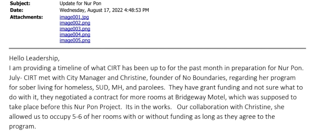 In an email to her supervisors in August 2022, Nicole Brandon, a member of the police’s CIRT team, explains her perspective on the fluid process being used to negotiate for rooms with No Boundaries.