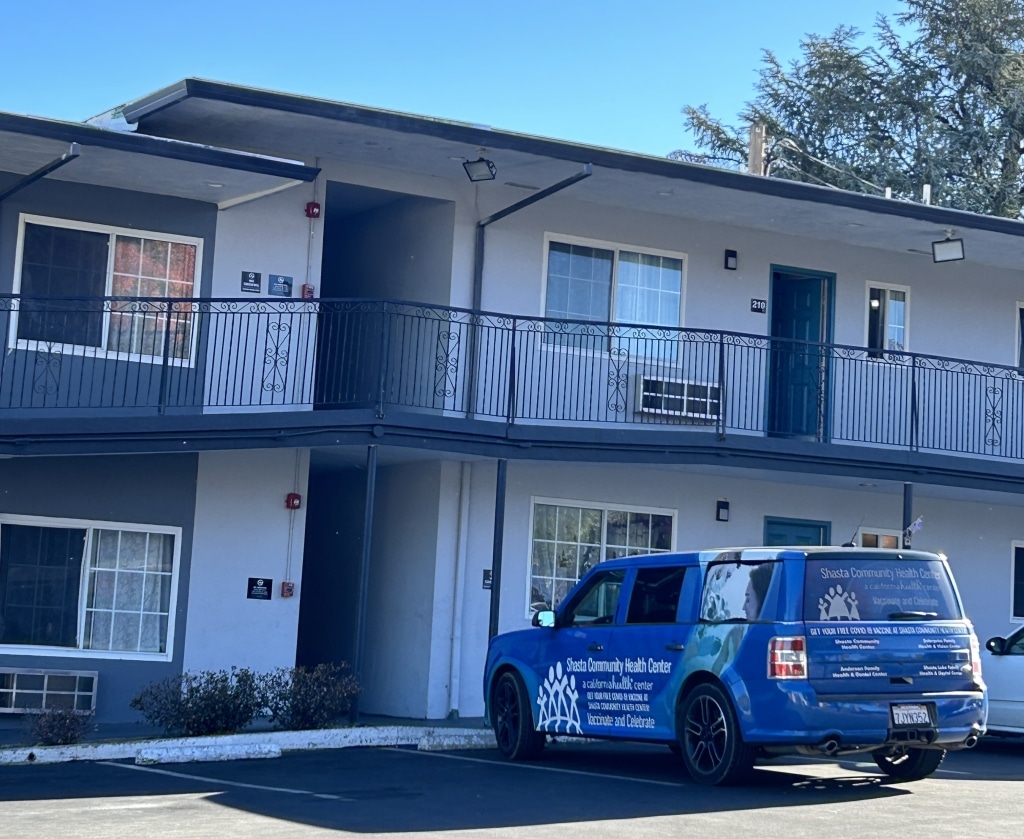Shasta Community Health Center staff were at the Sundial Lodge this morning, November 7. SCHC has been contracted by the City to stabilize and transition clients affected by a termination of a housing contract with No Boundaries. Photo by Annelise Pierce.