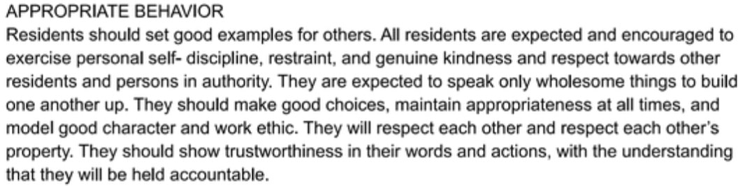 No Boundaries policies create additional barriers to housing by forbidding residents from a variety of other subjectively interpreted actions, including “insubordination,” having a “poor attitude,” “gossiping,” or possessing any property “presenting an indecent or immoral activity or ungodly belief or philosophy.” According to the policies, Cage is the arbiter of all decisions about what constitutes a violation of site policies.