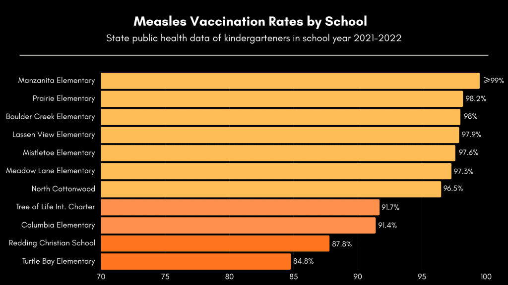 Redding Christian School isn’t the only school in Shasta County that had a measles vaccination rate below the 95% protection threshold as of the 2021-2022 school year. At the time, 17 out of 40 reported schools in Shasta County, or almost half, were under the 95% protection threshold for measles.