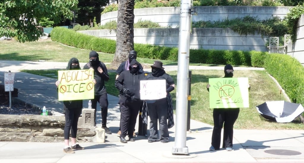 As the board met, a small group of protesters with signs denouncing the Trump Administration and ICE stood outside the administrative building to advocate against the board’s decision. Most of them were dressed all in black with their faces covered. In a previous interview with Shasta Scout some of the same protesters have said they dress this way for safety and solidarity denying that they identify as “antifa”.