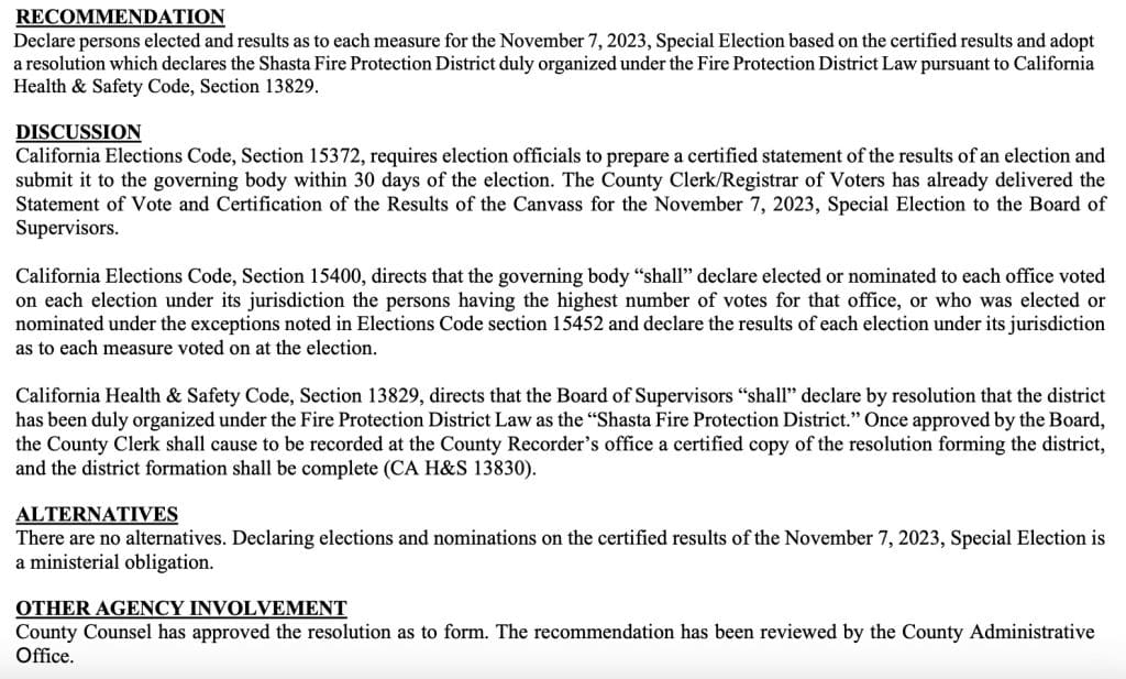 California Elections Code Section 15372, requires election officials to prepare a certified statement of the results of an election and submit it to the governing body within 30 days of the election. But the board’s approval isn’t needed to make election results final, a representative from the Secretary of State’s Office confirmed for Shasta Scout on Friday, March 15.