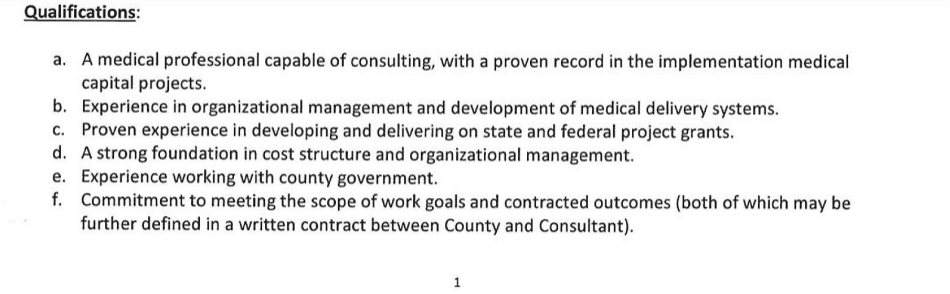 In emails sent to prospective applicants on January 17, CEO Rickert shared the specifications for the contract, which required the applicant to be a “medical professional.” During the Board’s discussion of whether to hire Street, Supervisor Allen Long questioned what medical professional experience Street had. In response, CEO Rickert said he believed Street’s proposal was proof enough that he was qualified.