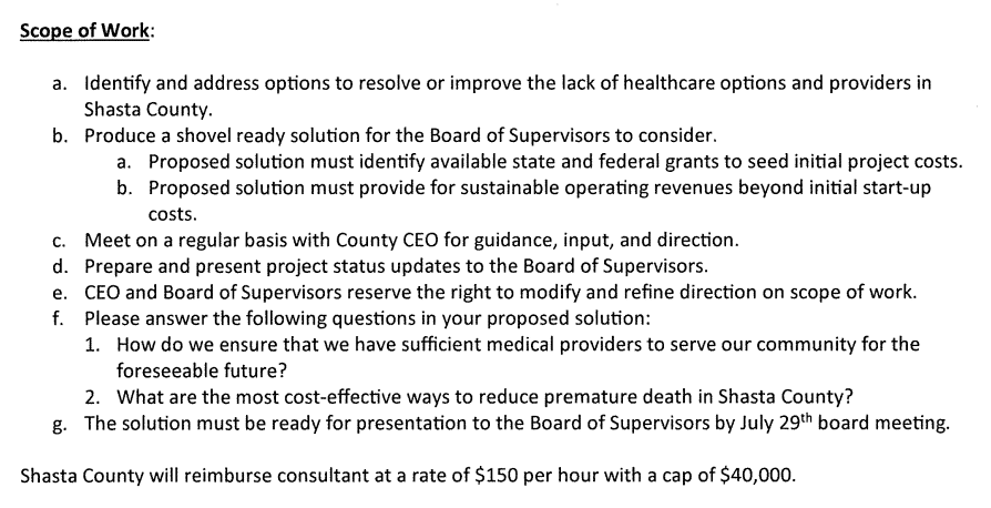 According to the scope of work submitted to potential applicants, the County intends the contracted healthcare consultant to identify and address how to improve the lack of healthcare options in Shasta County and produce a “shovel-ready solution” which identifies state and federal grant sources. What the term “shovel-ready” means in this situation has not been discussed by the Board and is not defined in the scope of work.