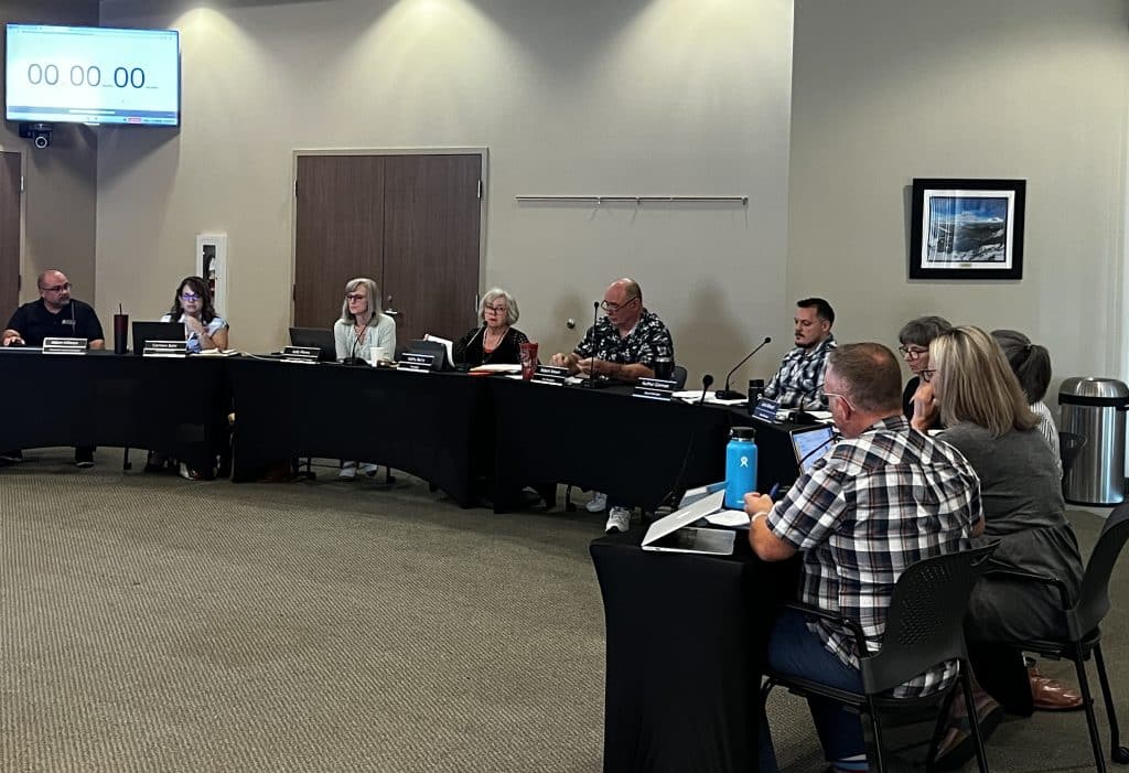 The seven members of the SCOE Board sit beside SCOE Superintendent Judy Flores and other SCOE staff on August 9, 2023. Photo by Annelise Pierce.