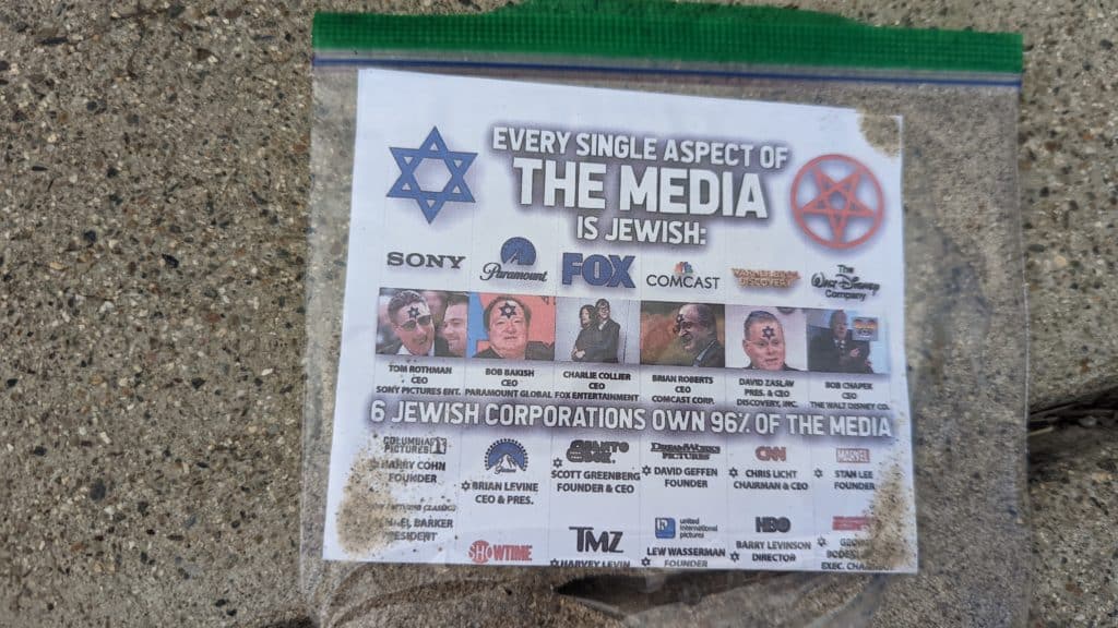 In late July, the same kind of materials, depicting a star of David beside a pentagram with the words, “96% of the media is Jewish,” were distributed in Redding’s Hacienda Heights neighborhood. The Redding Police Department opened an investigation into a report of that distribution, calling it a hate incident.