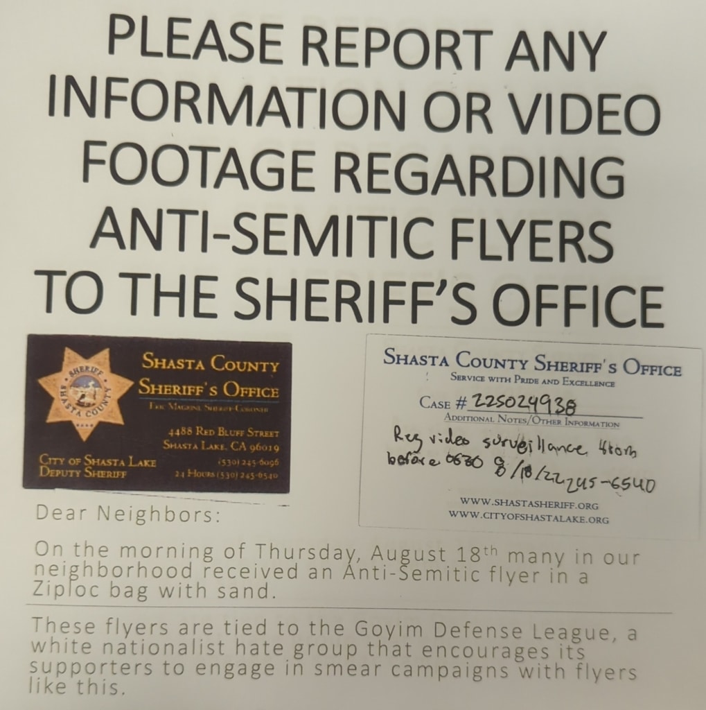 Sheriff’s Office Provides Little Response To New Distribution of Antisemitic Materials In City Of Shasta Lake