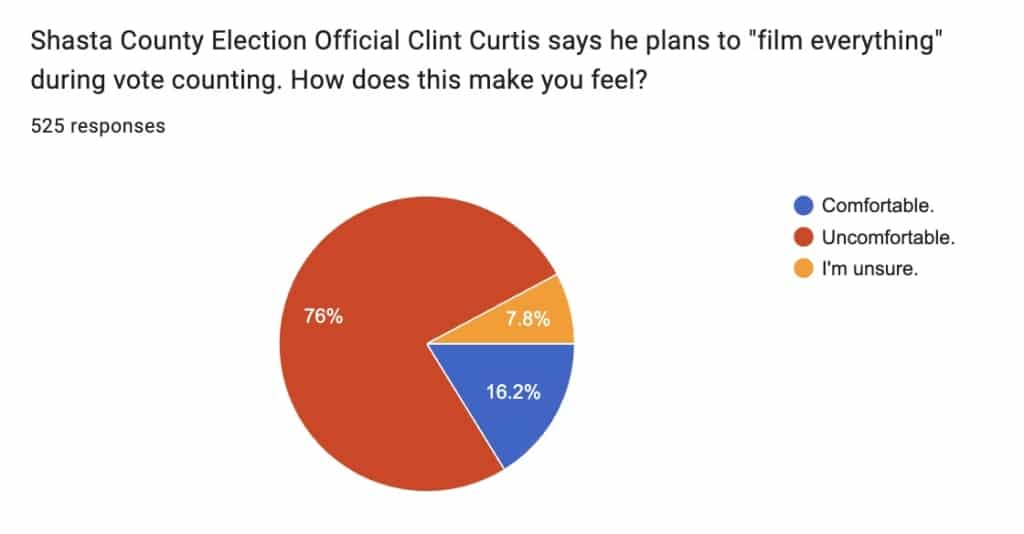 The majority of survey respondents, about 76%, said they were uncomfortable with the plan to film ballot processing. A much smaller percentage, 17.5%, said Shasta County’s decision to do so might discourage them from voting at all.