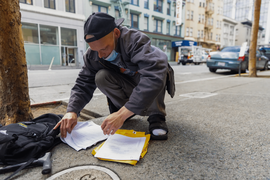 Bradford Berger sorts through his eviction paperwork on the sidewalk in front of Sala Burton Manor in San Francisco on March 3, 2025. The apartment building in the Tenderloin neighborhood is where Berger and his partner are fighting eviction after their landlord declined to accept rental assistance funds. A proposal pending in the Legislature seeks to ban the practice, aligning California with 20 other states. Photo by Estefany Gonzalez for CalMatters
