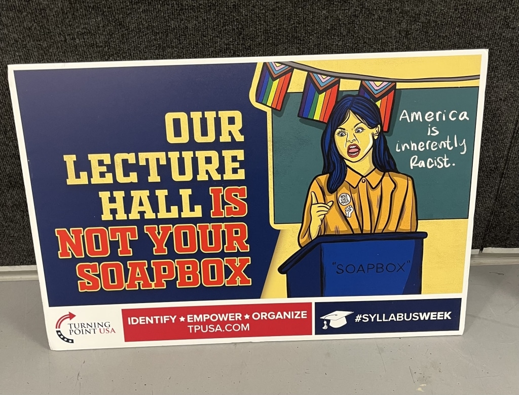 Nearby were several booths. Some had informational pamphlets from a local bible college and others, staffed by Turning Point USA representatives, displayed posters. One read “OUR LECTURE HALL IS NOT YOUR SOAPBOX,” illustrated by a drawing of an angry college professor backgrounded by pride flags.